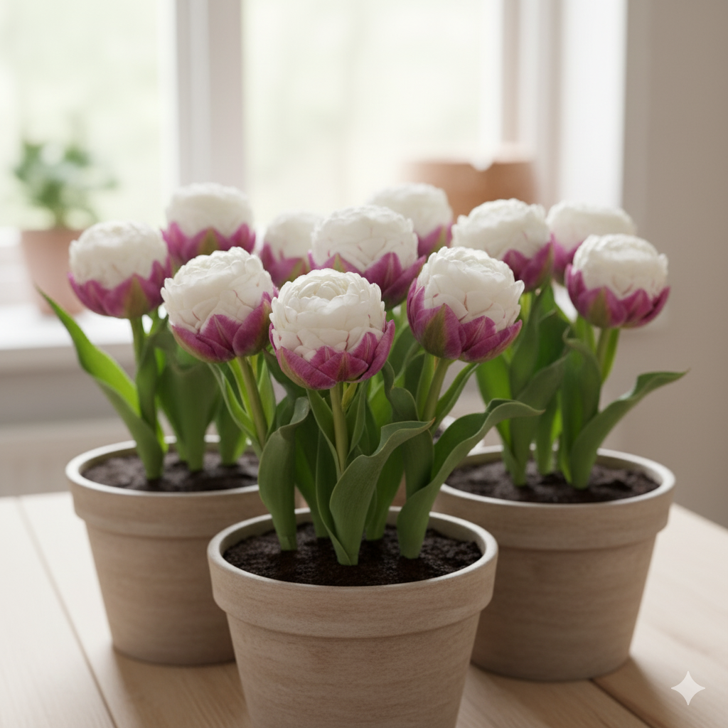 Для успішного вирощування тюльпанів «Ice Cream» у кімнатних умовах оберіть світле місце з м’яким, розсіяним освітленням.